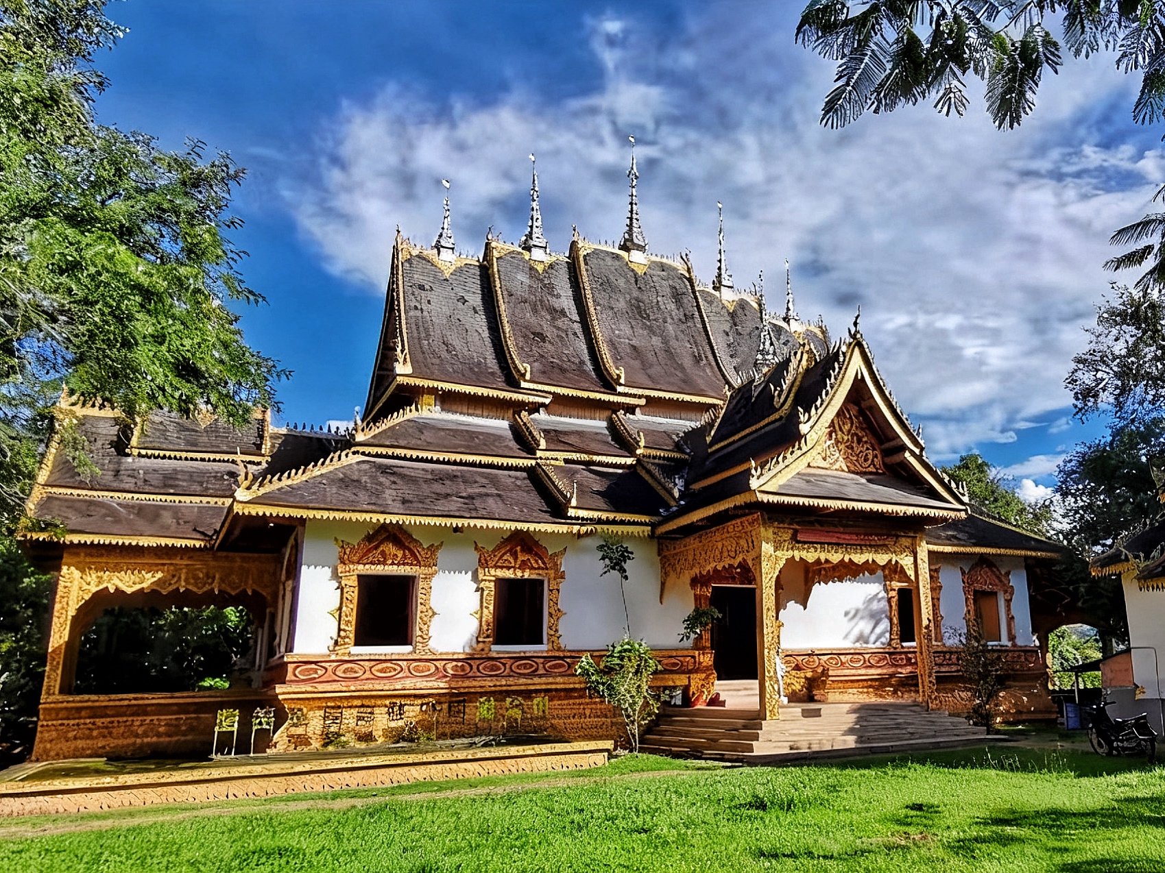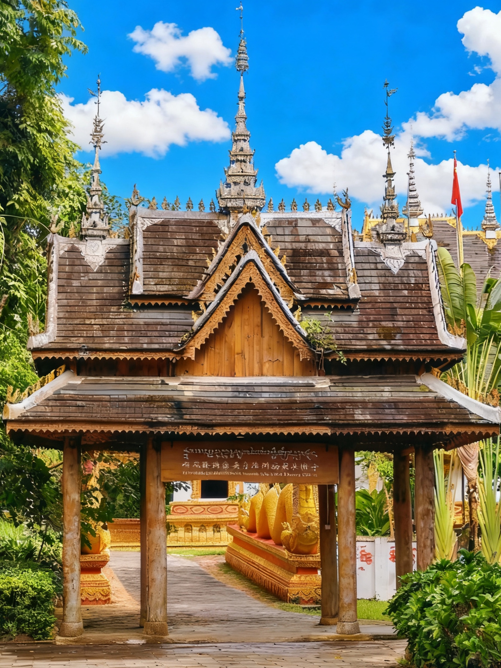毛孩子的身影与傣式建筑相映